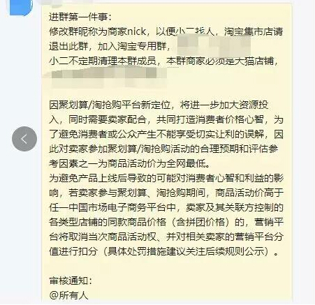 据悉,天猫小二在商家群发布通知称,因聚划算/淘抢购平台新定位,将进一步加大资源投入,同时需要卖家配合,共同打造消费者价格心智,为了避免消费者或公众产生不能享受切实让利的误解,因此对卖家参加聚划算/淘抢购活动的合理预期和评估参考因素之一为商品活动价为全网最低。