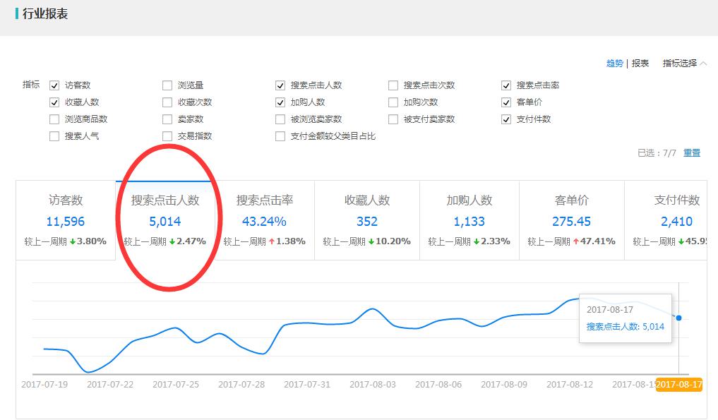 然后我们再去行业大盘里面查看一下,下滑那段时间的搜索点击人数。如果整个行业的趋势都是处于下滑的阶段,那么就没有必要去大惊小怪。这个和旺季、淡季、活动、天气、物流等一些因素都是有影响的。