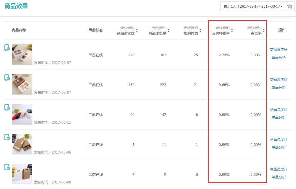 既然下滑了那么我们就打开单品分析,我们就可以从这里看到,无线端搜索给我们带来了多少的访客。