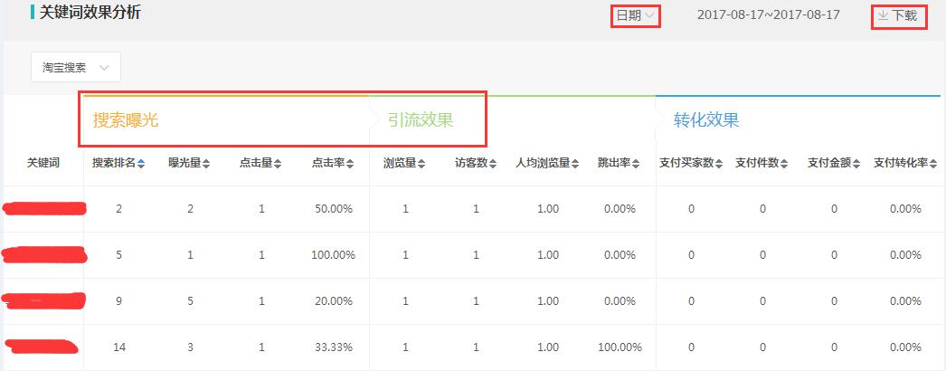 如果说看不清楚的话,可以点击旁边的下载。下载之后我们把这些关键词用一个表格填写好。然后我们在表格里面可以清楚的看到这些关键词的引流效果,这里会出现一种情况,如果引流下降幅度特别大的词,你就需要好好的去注意了。