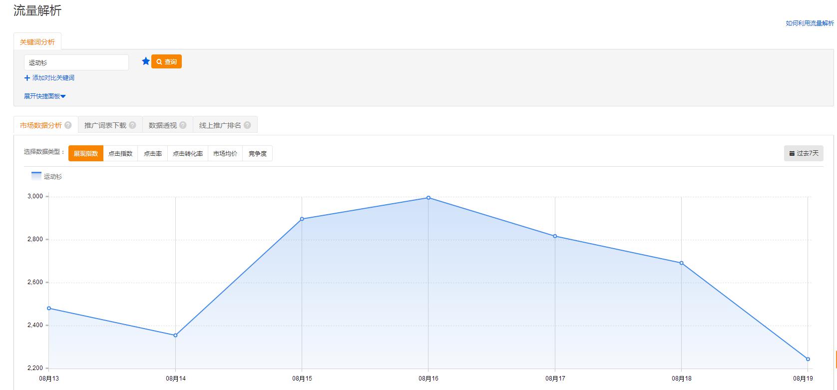 在这里我并没有马上说去维护,因为我们需要看这个词在行业里面是否发生下滑了。这样就好去判断需不需要维护。比如说运动衫这个时下滑了,我们就可以去通过生意参谋里的市场行情,去看是否有出现搜索人气降低。如果没有生意参谋的商家们也不要紧,我们还可以用直通车的流量解析去查看这个词的展现情况是什么样的。