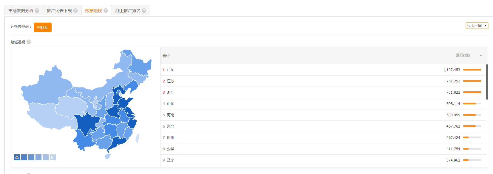 这里是地域流量来源数据,我们可以选择一周的数据,这里可以查看地域的展现指数,点击率和转化率等,我们可以通过这些数据通过搜索自己要推广的关键词搜索分析这个词在不同的地域有什么样的表现。如果这个词的数据相对高的话,比如说点击转化都非常不错的情况下,我们就可以通过图1中地域设置选择要投放的地域。在这个搜索词下,地域数据好,人群也自然是精准的。那是不是选择地域精准之后我们就不用去选择其他设置了,当然不是,这只是人群精准的开始,接下来我们在来细分一下地域中的精准人群。